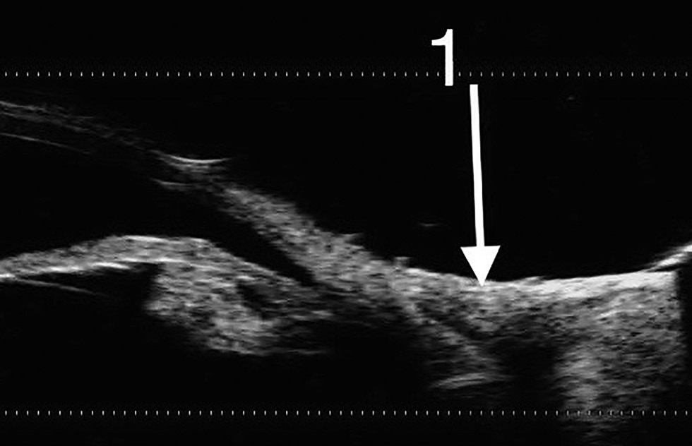 Рис. 5. Ультразвуковая биомикроскопия на 45-е сутки после операции. Стрелкой обозначена зона хирургического вмешательства (1).
