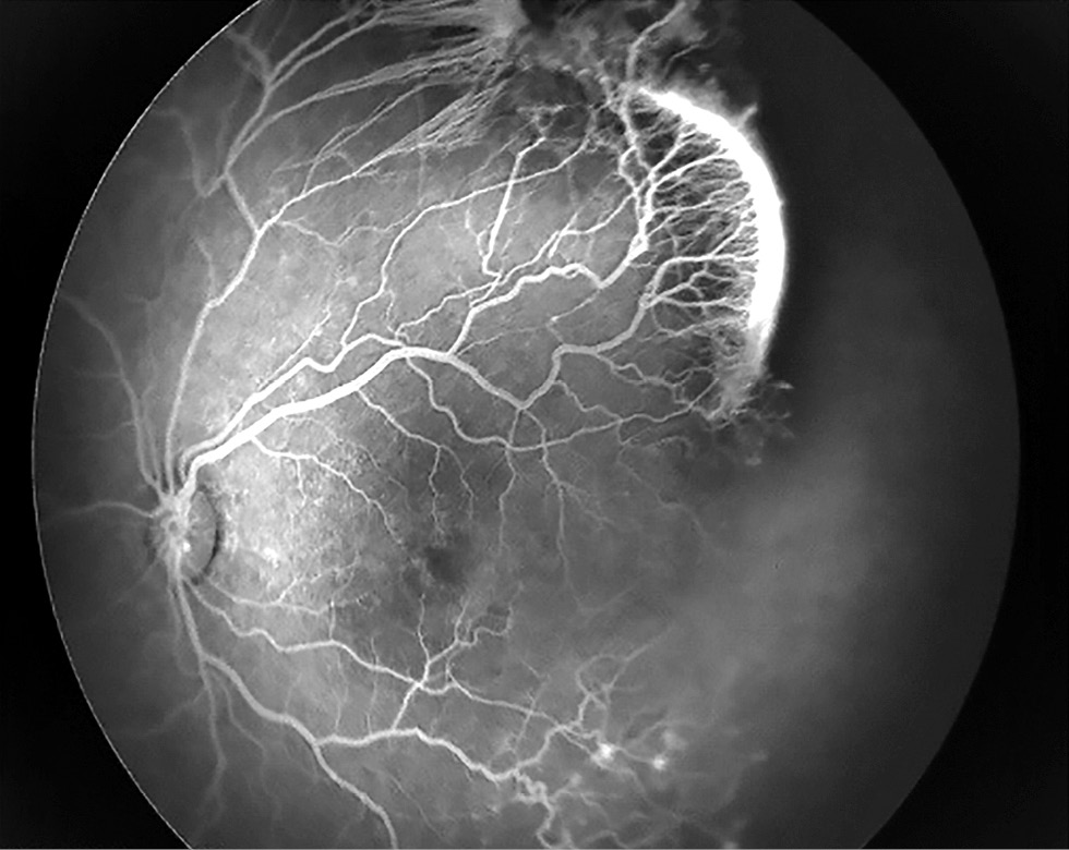 Офтальмолог осуществлял динамическое наблюдение еженедельно, результаты которого продемонстрировали усиление сосудистых изменений — от развития ретинопатии (рис. 2, a), вероятно связанной с тромбозом центральной вены сетчатки, до пролиферативных осложнений на поражённом глазу (см. рис. 2, b). С целью уточнения диагноза проведена флуоресцентная ангиография сетчатки с помощью широкопольной педиатрической ретинальной камеры RetCam 3® (Natus Medical Inc., Соединённые Штаты Америки). Обнаружена локальная гиперфлуоресценция в зоне предполагаемой окклюзии, а также признаки неоваскуляризации (рис. 3), требовавшие безотлагательной лазеркоагуляции ишемических зон сетчатки для предупреждения её отслойки.