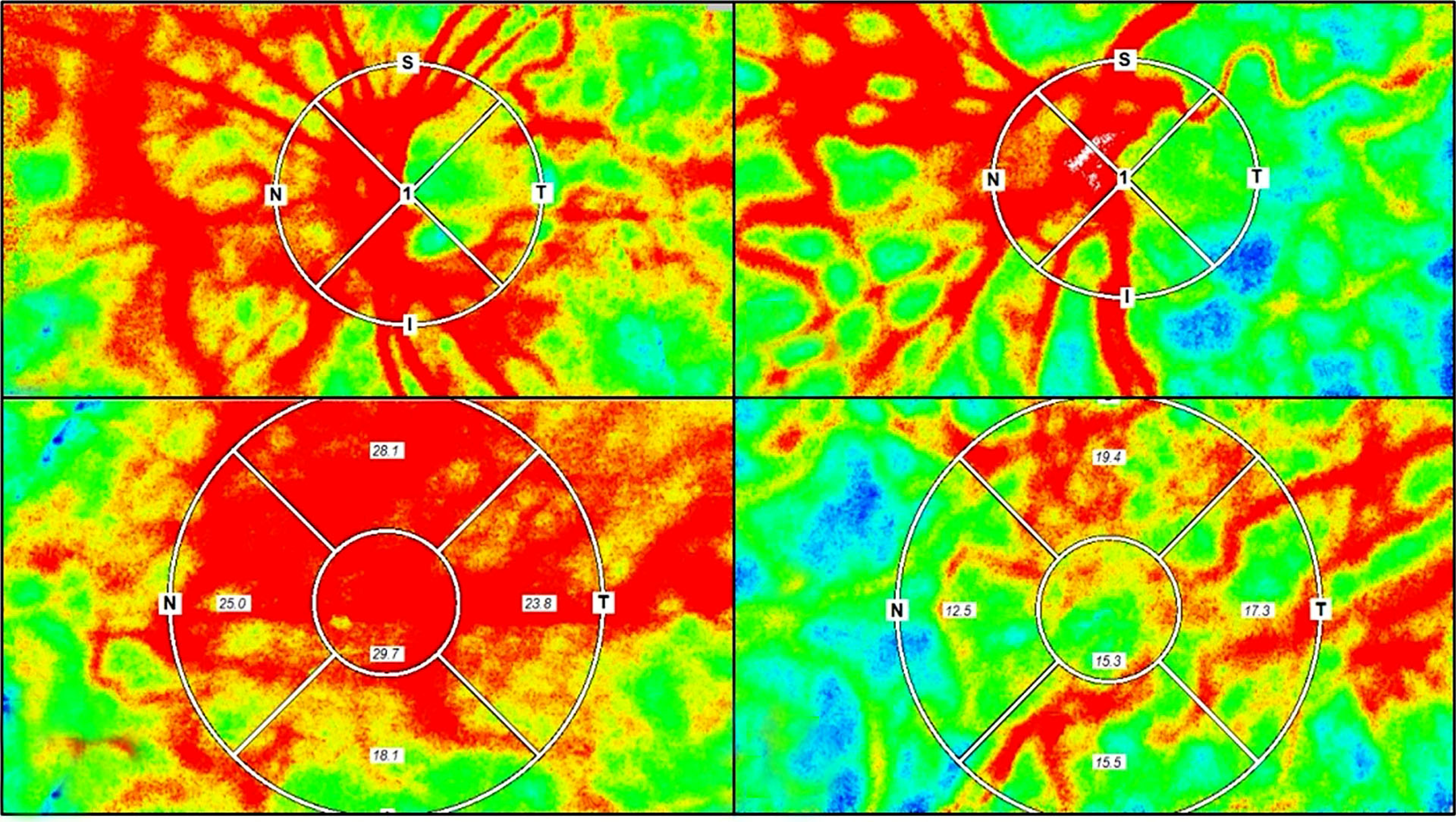 Кроме того, мы проанализировали вариабельность кровотока ДЗН по четырём секторам. Выявлено снижение кровотока в височном секторе ДЗН, наиболее значимое по показателю МV. У здоровых лиц его снижение составило 30,5%. Это связано с тем, что в височном секторе сосуды расходятся выше и ниже папилломакулярного пучка, и крупные сосуды в меньшей степени попадают в участок височного сектора ДЗН. При этом в верхнем и нижнем секторах показатели, напротив, превышали средние значения: у здоровых лиц значения MV выше на 18%. Данная тенденция отмечена у всех пациентов, колебание указанного показателя связаны с индивидуальным расположением сосудов.