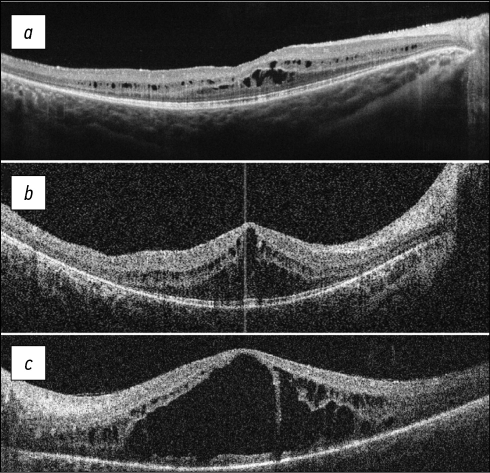 Рис. 1. Состояние слоя фоторецепторов у детей с пигментным ретинитом и кистовидным макулярным отёком по данным оптической когерентной томографии: а — слой фоторецепторов сохранён; b — частичная деструкция, c — полная деструкция.