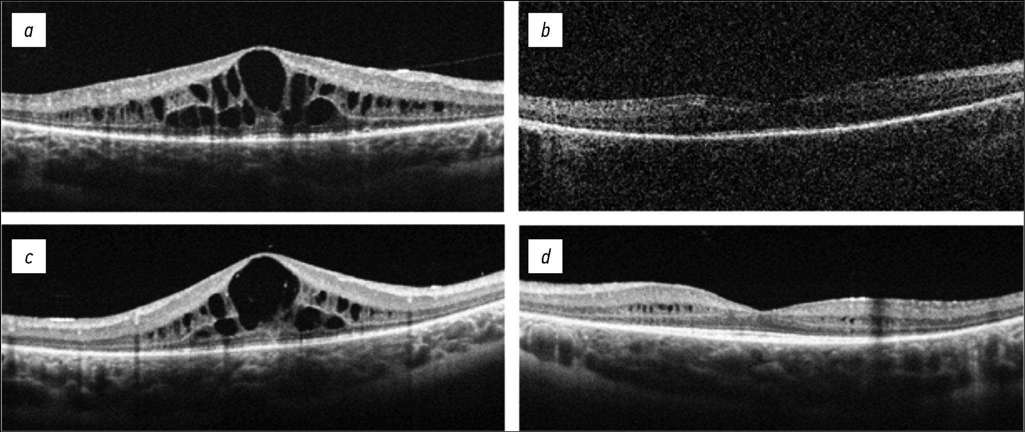 Рис. 2. Пациент П. 16 лет. Результаты оптической когерентной томографии. Правый глаз а и левый b глаз до начала введения триамцинолона, Кистовидные полости в наружном и внутреннем ядерных слоях сетчатки. Центральная толщина сетчатки справа 618 мкм, слева 626 мкм после 10 введений тримцинолона. Справа c — резорбция макулярного отёка, ЦТС 272 мкм. Слева d — небольшие кистовидные полости в слоях сетчатки парафовеально, ЦТС 201 мкм.