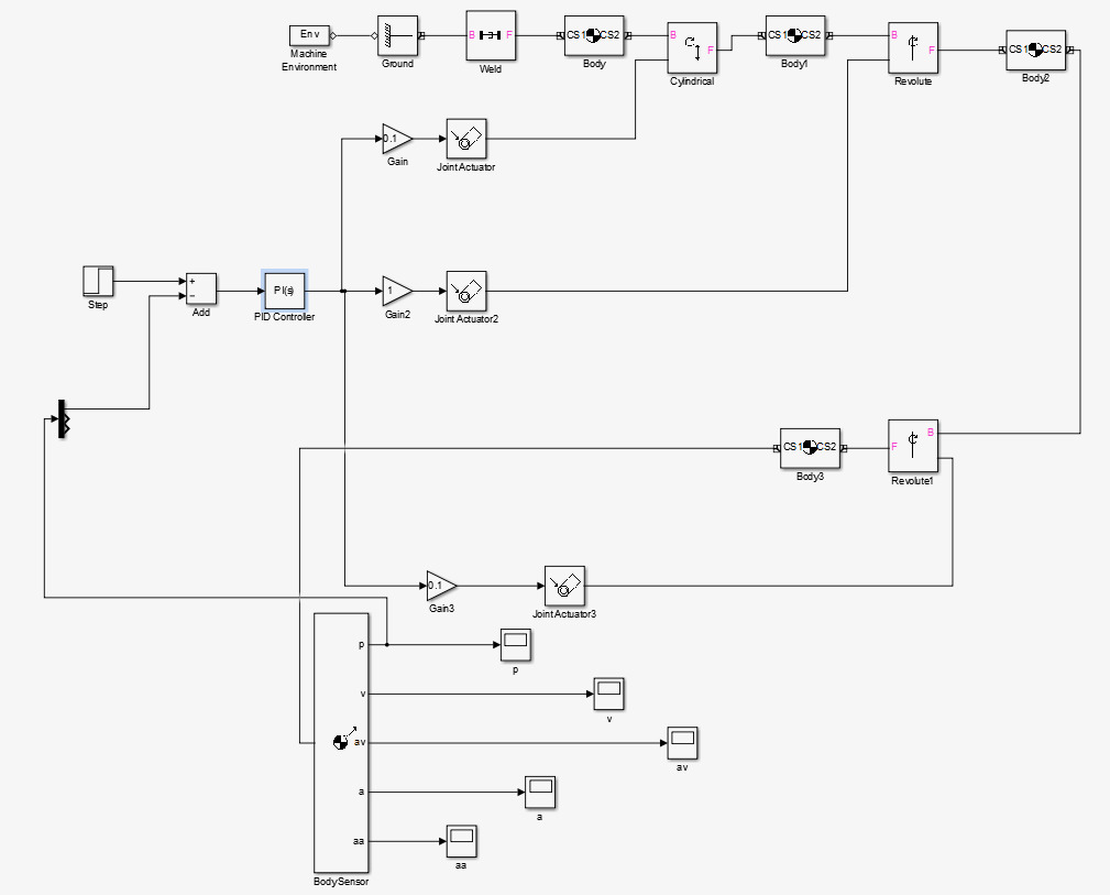 Схема, показанная на рис. 3, моделирует поведение манипулятора, состоящего из четырех идеальных твердых тел («Плечо» — блок Body, «Предплечье» — Body1, «Кисть» — Body2, «Захват» — Body3). Манипулятор приводится в движение одной цилиндрической и двумя угловыми передачами. Блоки Joint Actuator необходимы для передачи управляющего усилия на передачи, моделируя, таким образом, приводной двигатель. Блок Body Sensor позволяет получит координаты, скорость, линейные и угловые ускорения захвата.