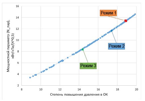 Как видно из рис. 6, несмотря на сильные отличия рассмотренных режимов (изменение режима работы, изменение КПД осевого компрессора), зависимость мощностного параметра от степени повышения давления в ОК для этих режимов с высокой точностью ложится на одну линию.
