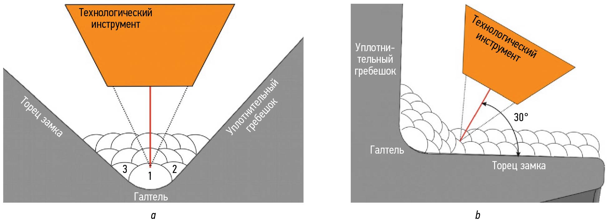 При наплавке торца замка технологический инструмент наклоняется на 30 градусов, и начало наплавки осуществляется с границы крайнего валика, полученного на предыдущем этапе. Наплавка осуществляется до кончика торца в 2 слоя. Восстановление уплотнительного гребешка осуществляется аналогично.
