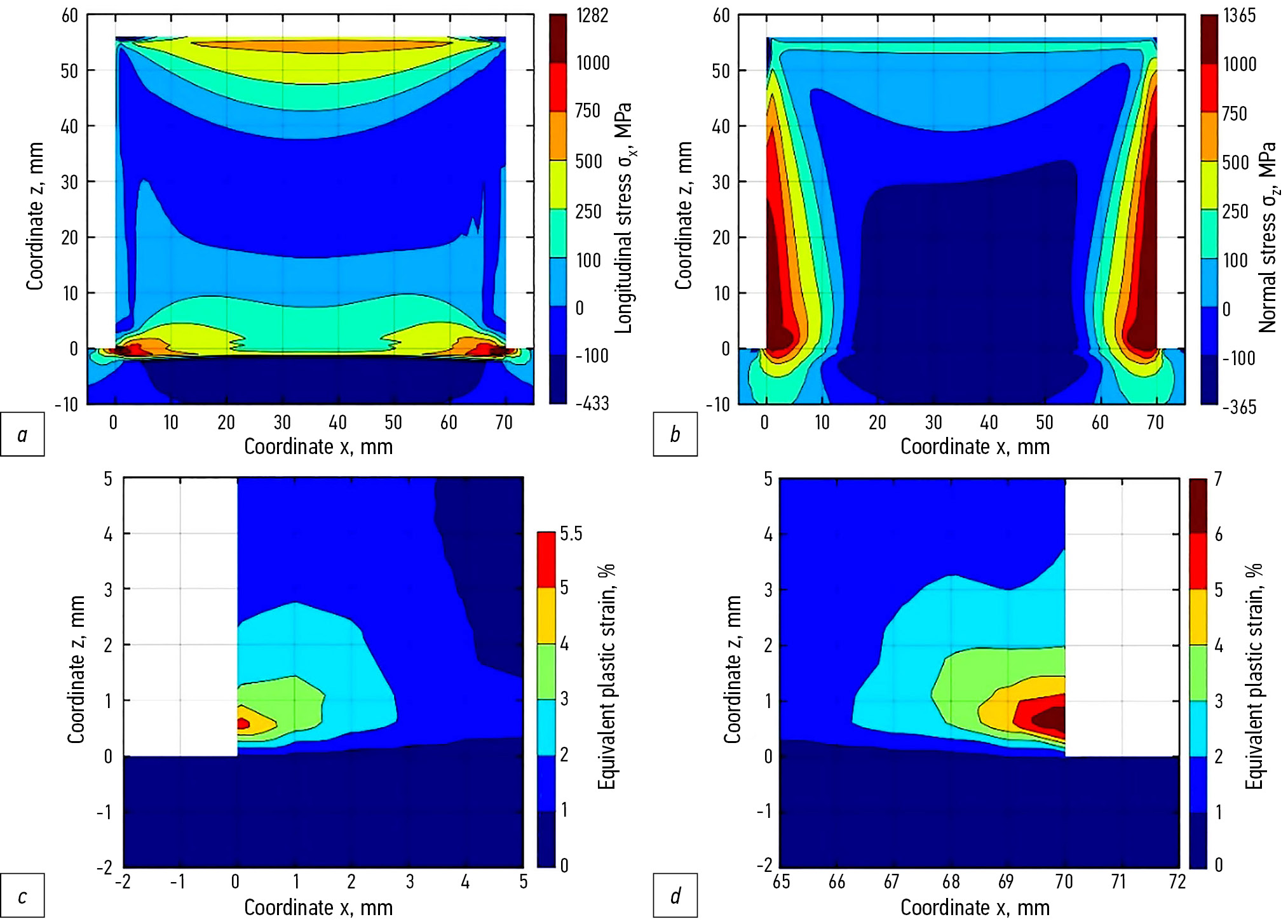 Увеличение высоты наплавки в 2 раза по сравнению с раннее проанализированной в [8] не приводит к изменению характера распределения продольных напряжений σx вблизи вершины наплавки (рис. 3, а). Основные изменения наблюдаются в средней части наплавки, где формируется область сжимающих напряжений σx. Практически во всем объеме наплавки продольные напряжений изменяются в пределах ±200 МПа. Сравнение полученных полей нормальных напряжений σz (рис. 3, b, d) с представленными в [8] для наплавки высотой 28 мм показали, что увеличение высоты приводит к расширению области концентрации растягивающих напряжений σz, превышающих предел текучести. На левом торце, где начинается наплавка слоев, эта область достигает половины высоту наплавки, а на противоположном торце уже захватывает 80% высоты. Расширение областей растягивающих напряжений у торцов наплавки может быть уравновешено только за счет увеличения уровня сжимающих напряжений в центре наплавки. Накопленные пластические деформации при увеличении высоты стенки в два раза увеличиваются лишь на 1,1% (рис. 3, c, d). Максимальная величина деформаций, составляющая 7%, превышает пластичность сплава Ti-6Al-4V, полученного методом ПЛВ [18]. На практике локальная пластичность металла вблизи массивной подложки будет ниже, чем у остальной наплавки, вследствие более высокой скорости охлаждения. Это является причиной отрыва торцов наплавки от подложки.