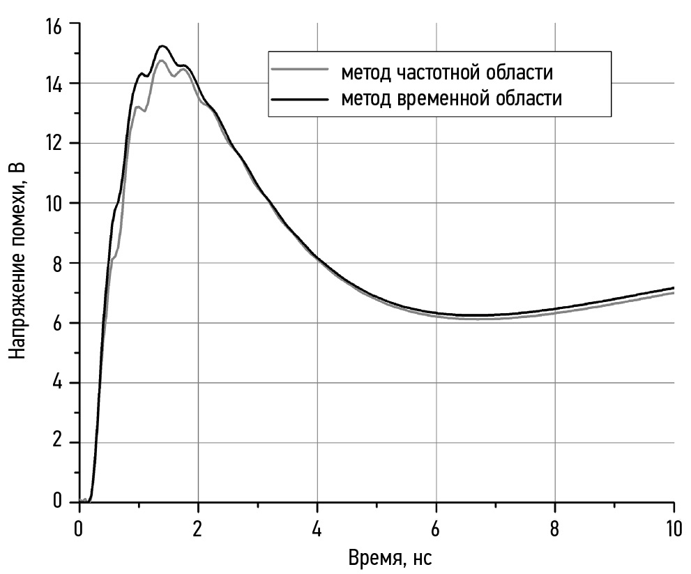 Результаты. Результаты, полученные с помощью методов частотной области и методов временной области, совпадают с достаточной для практических расчетов точностью. При этом воздействие каждой частотной составляющей анализируется независимо, что допускает высокую степень параллелизации вычислений, в то время как расчет методами временной области требует завершения расчетов для предшествующих моментов времени. Требования к размеру элементов расчетной сетки определяются длиной волны на максимальной учитываемой частоте.