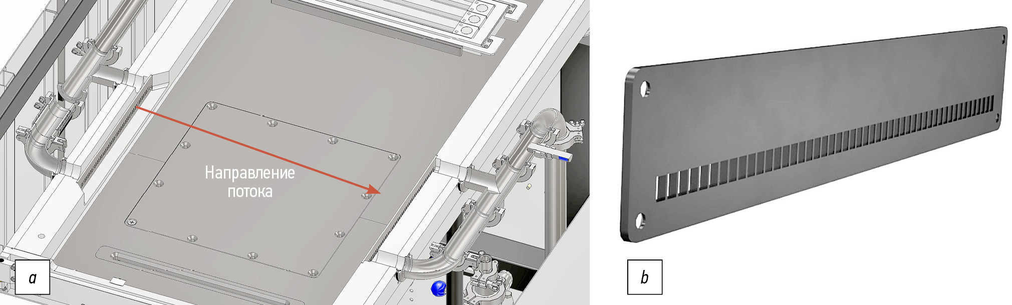 Как показано на рис. 4, а, поток газа поступает в камеру по двум трубам. Если используется деталь, изображенная на рис. 4, b, то скорость потока газа на разных участках платформы неодинакова и в некоторых местах поток газа полностью отсутствует. В то же время использование ламинаризатора обеспечивает практически равномерное распределение расхода газа по всей поверхности платформы.