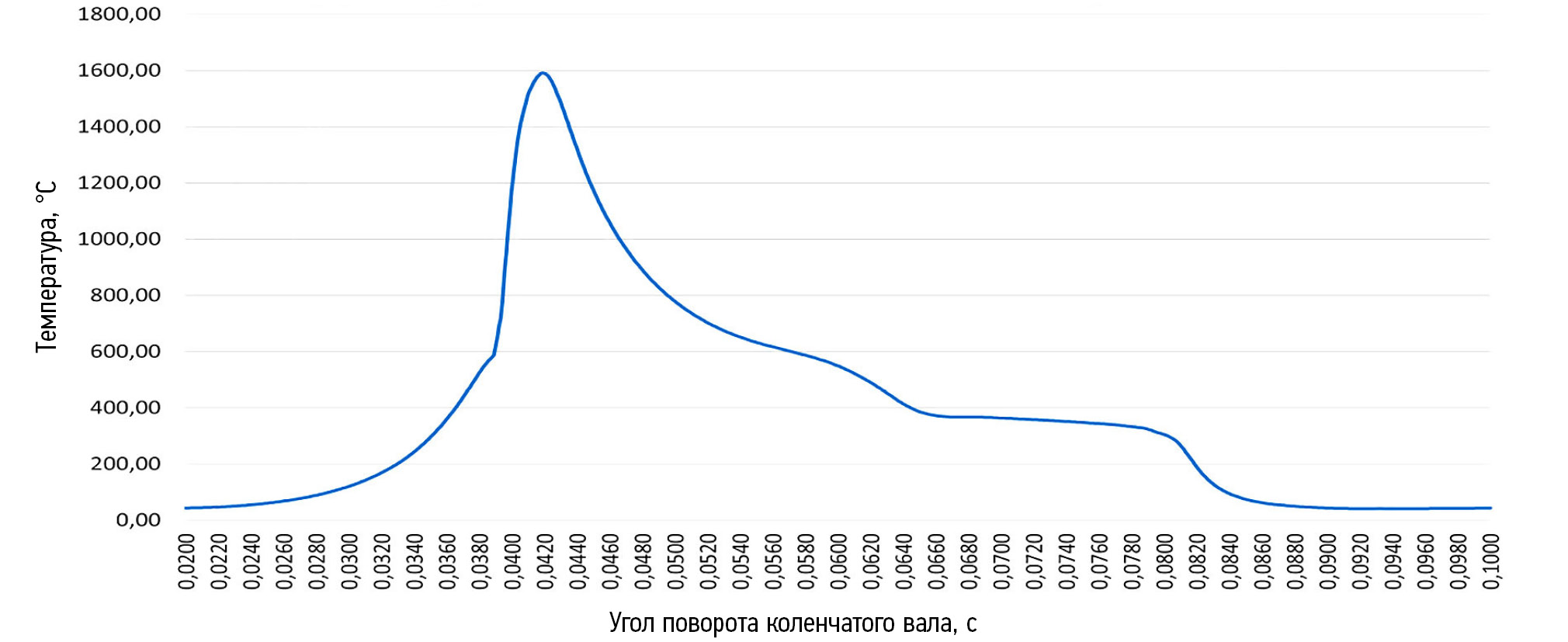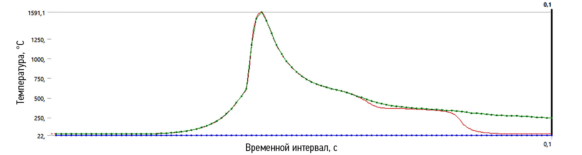 Временной интервал исследования составляет доли секунд, а именно согласно рис. 2 от 0,02 до 0,1 с. Результаты динамического термомеханического расчёта брались в наивысших, максимальных (max) нагрузках в данном временном интервале. По температуре максимум составил на временном отрезке 0,0419 с с наивысшей Т = 1591,10°С. Температура внешней среды в момент исследований оставалась постоянной и равнялась 22°С.
