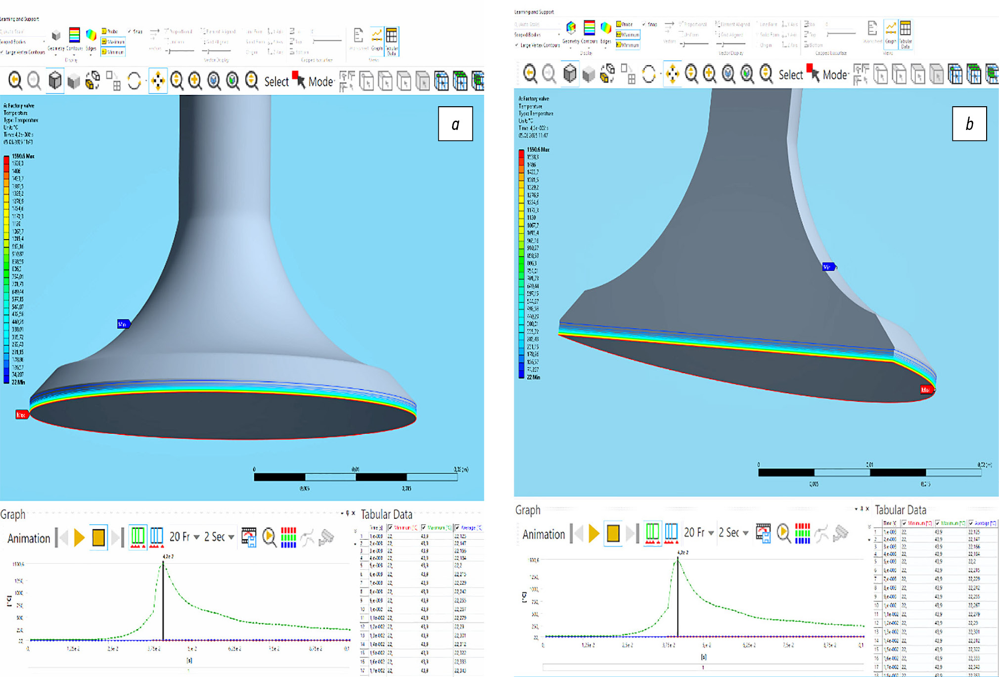 Рис. 10. Фрагмент распределения температуры внутрь тарелки клапана от 1590,6°С до 60°С, данное расстояние от max до min температуры = 1 мм (a); распределение Т от 60°С до 22°С, на расстоянии более 3 мм вглубь тарелки (b).