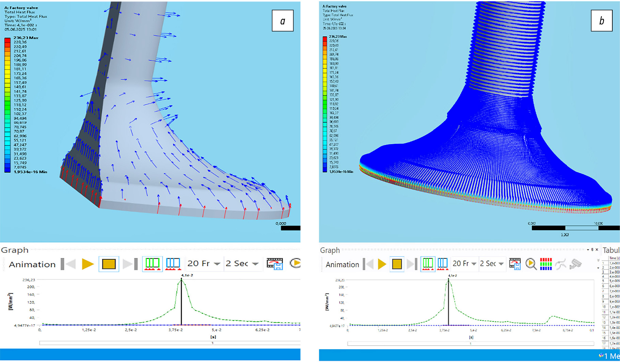 Выводы. В результате проведённого моделирования были получены данные по распределению температуры внутри тарелок исследуемых клапанов, из стали 40Х, которую имеется возможность просмотреть в любой момент исследуемого интервала. При изучении теплового потока в клапанах разных конструкций было выявлено, что тепловой поток увеличился в клапане с 3 лопастями = 283,12 Вт/мм2, а в конструкции с 6 лопастями = 281,49 Вт/мм2.