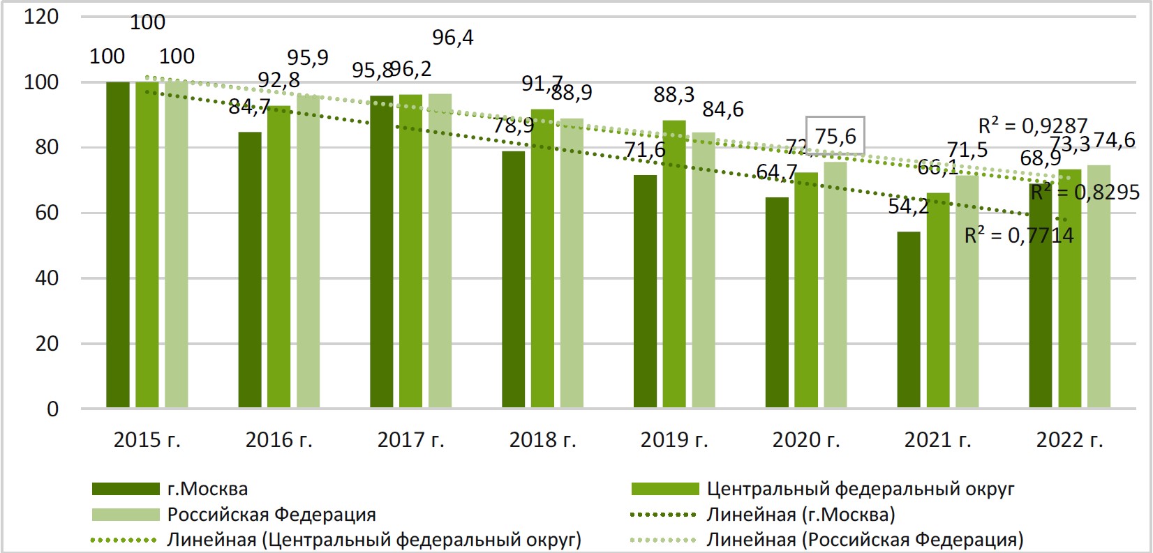 Вместе с тем, из рисунка видно, что показатели наглядности в целом за 8 лет (в 2022 г. по сравнению с 2015 г.) в Москве составили 68,9 %, в ЦФО – 73,3 %, в РФ – 74,6 % соответственно. Большее снижение численности впервые признанных инвалидами детей вследствие ВПС в Москве обосновано, по нашему мнению, большей доступностью медицинской помощи детям, в частности, доступностью диагностики и высокотехнологичной медицинской помощи [13, 14].