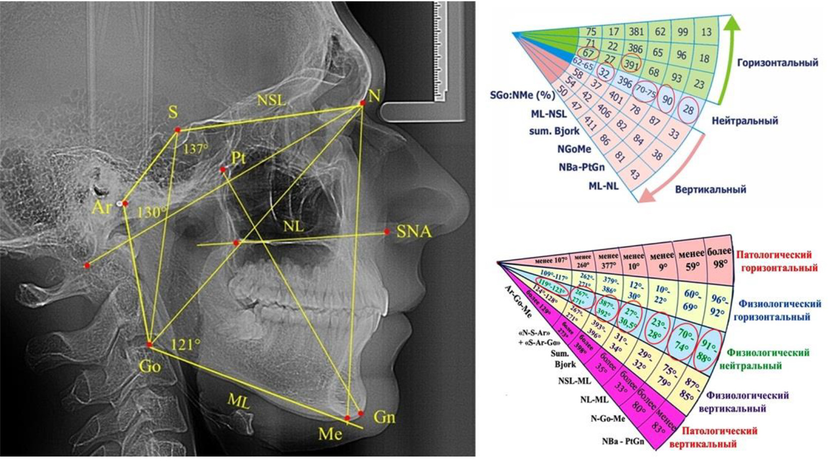 Сравнительный анализ традиционного анализа типов роста лица с предложенными поправками провели при анализе рентгенограмм с различными типами нижнечелюстного угла.