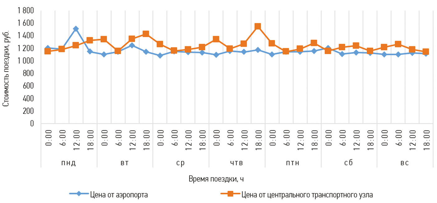 Такси является альтернативным способом передвижения. В отличие от общественного, таксомоторный транспорт не имеет четкого тарифа. Из-за этого стоимость поездки зачастую может отличаться более чем на 200 рублей, при этом средняя цена одной поездки до Железнодорожного вокзала будет равна 1200–1500 рублей (рис. 1). Это происходит в зависимости от следующих факторов: дня и времени суток, спроса и соответственно предложенного количества автомобилей в радиусе от точки, указанной при заказе такси. Интервалы движения такси минимальны, время подачи такси у аэропорта составляет около 2–7 минут, а время в пути зависит от загруженности трафика, в ночные часы — около 55 минут, в дневные — 80 минут [2].