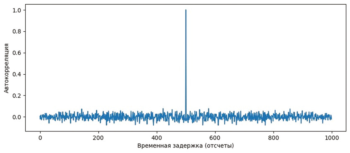 Автокорреляция — это математическое представление степени сходства между данным временным рядом и его запаздывающей версией на последовательных временных интервалах [3]. Функция автокорреляции в обработке сигналов показывает природу сейсмических сигналов. На рисунке 3 приведен пример автокорреляции сигнала с помехами.